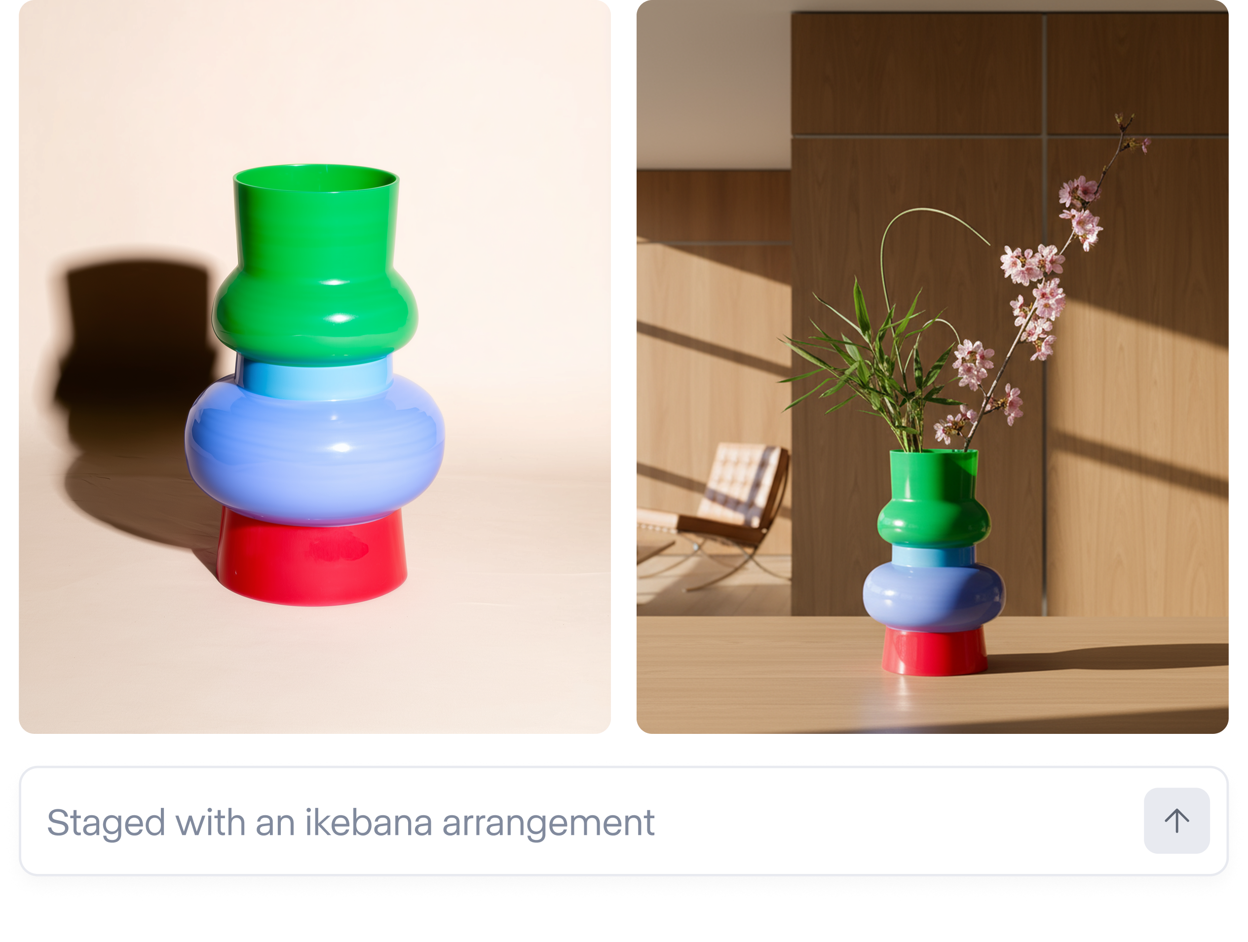 Reshoot any product without a camera. Upload your product photo, then transform the scene with presets or prompts. New backgrounds, lighting, staging—all in seconds.