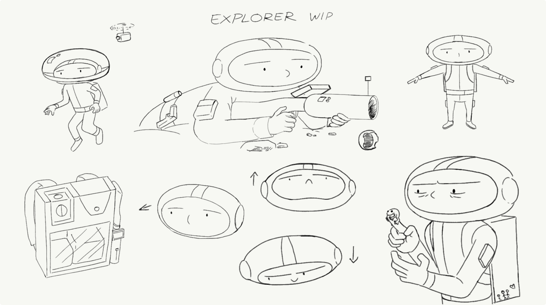 The character design in “Migration” is markedly simple. Although the mouth is one of the most expressive parts of a face, Jeremy felt that including eyes and a nose alone would communicate effectively underlining his frequent pull toward focused, clean design. The Explorer wears a white outfit to emulate that of an astronaut exploring in space, and to emphasize the purposeful progression of color and tone throughout the backgrounds in the film. There’s nothing that really defines the Explorer as anyone specific; this was intentional to ensure that the viewer could imagine themselves as the character, adding to the overall sense of adventure and discovery.