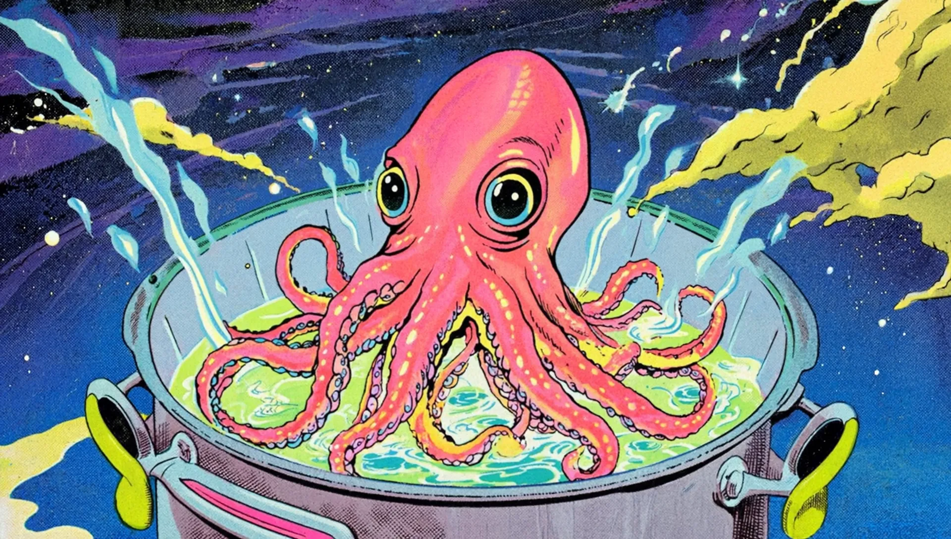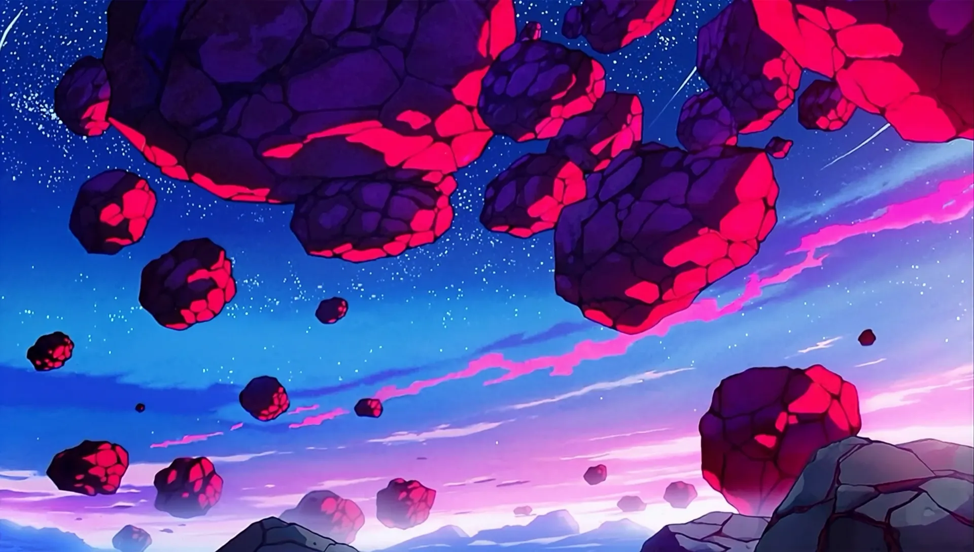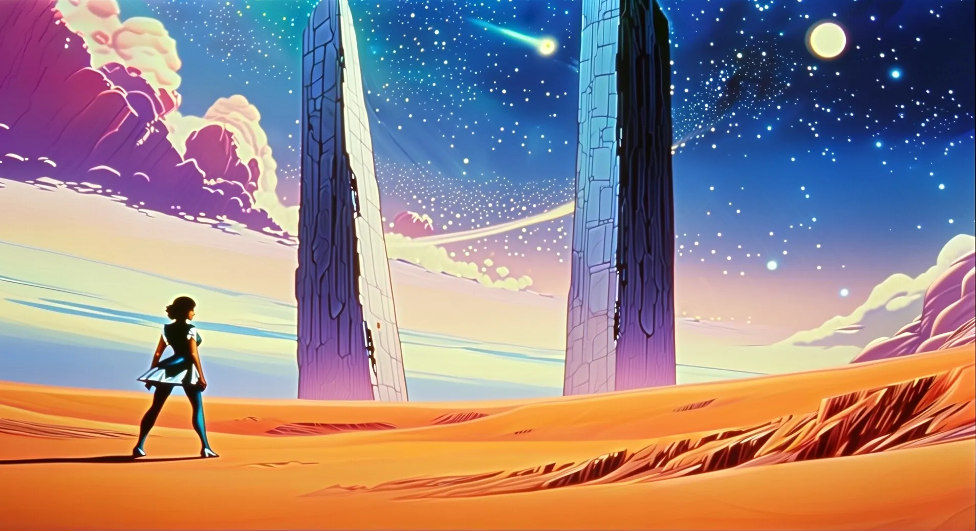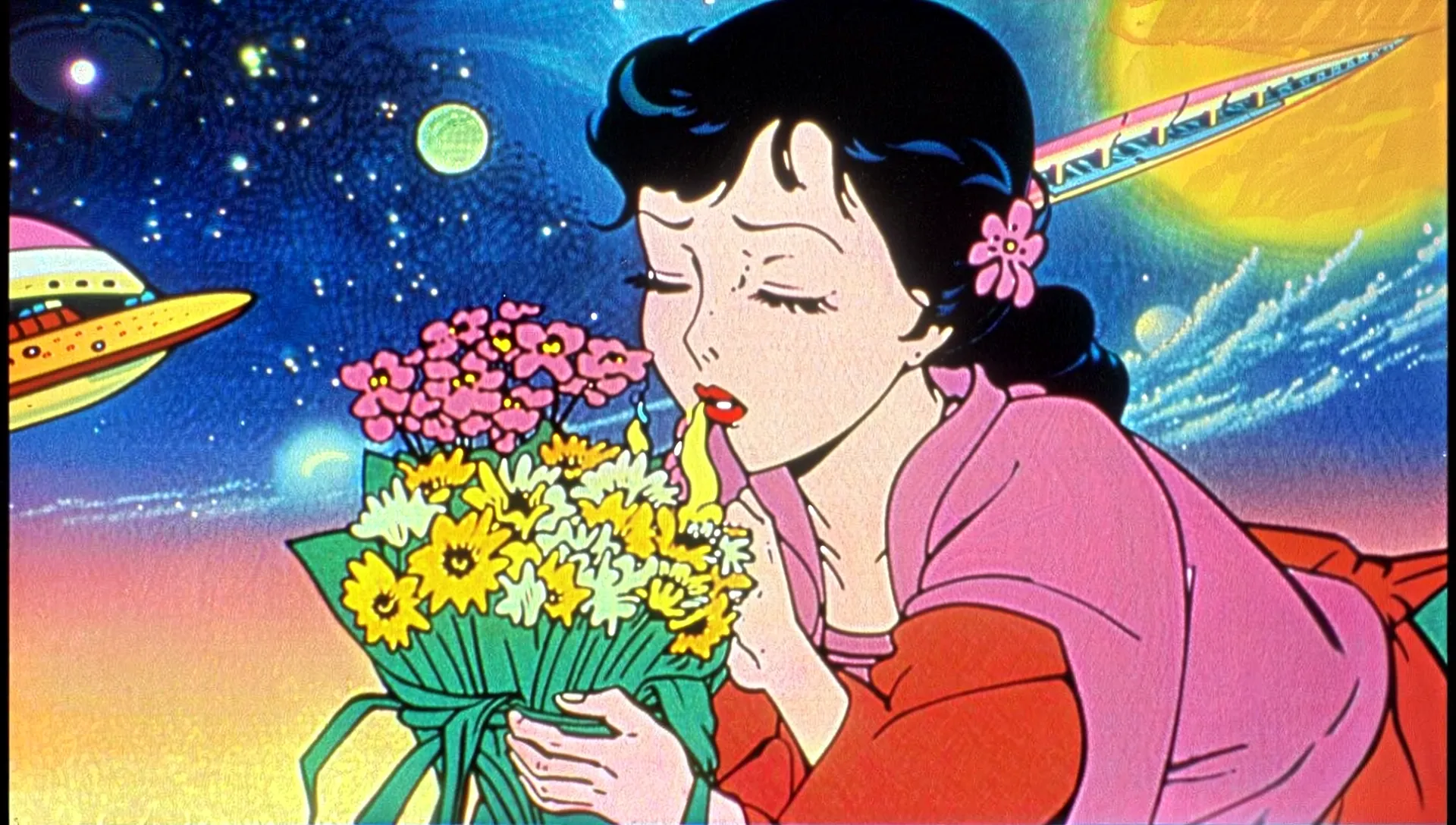 Retro anime aesthetics meet dreamy sci-fi in a technicolor explosion of flowers and flying saucers. That distinct 70s manga feeling - bold lines, cosmic backgrounds, and an irresistible mix of the romantic and the surreal.