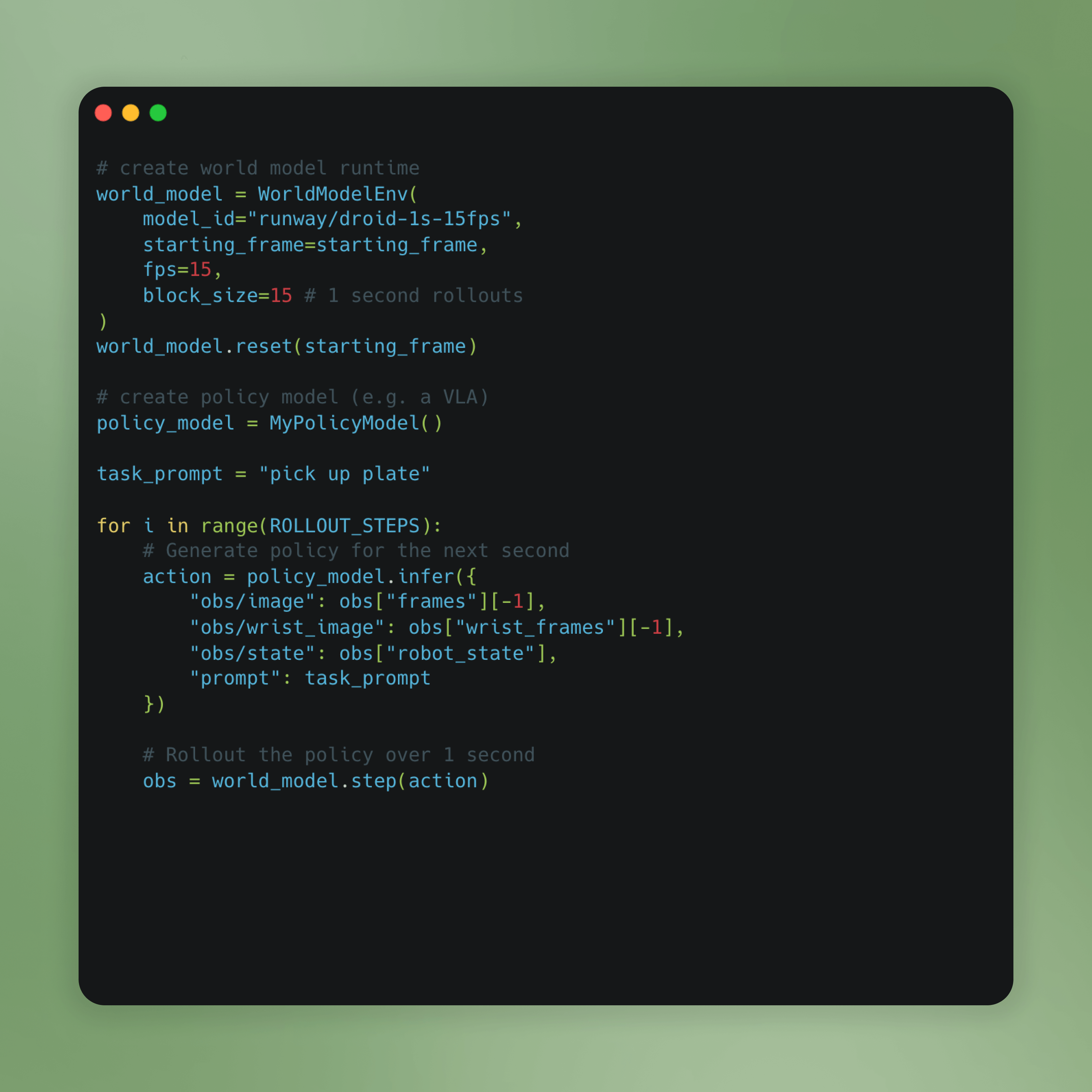 Test the performance of your policy models (such as VLA models like OpenVLA or OpenPi) directly within Runway's world model instead of deploying to physical robots. This approach is faster, more reproducible, and significantly safer than real-world testing while still providing realistic behavioral assessments.