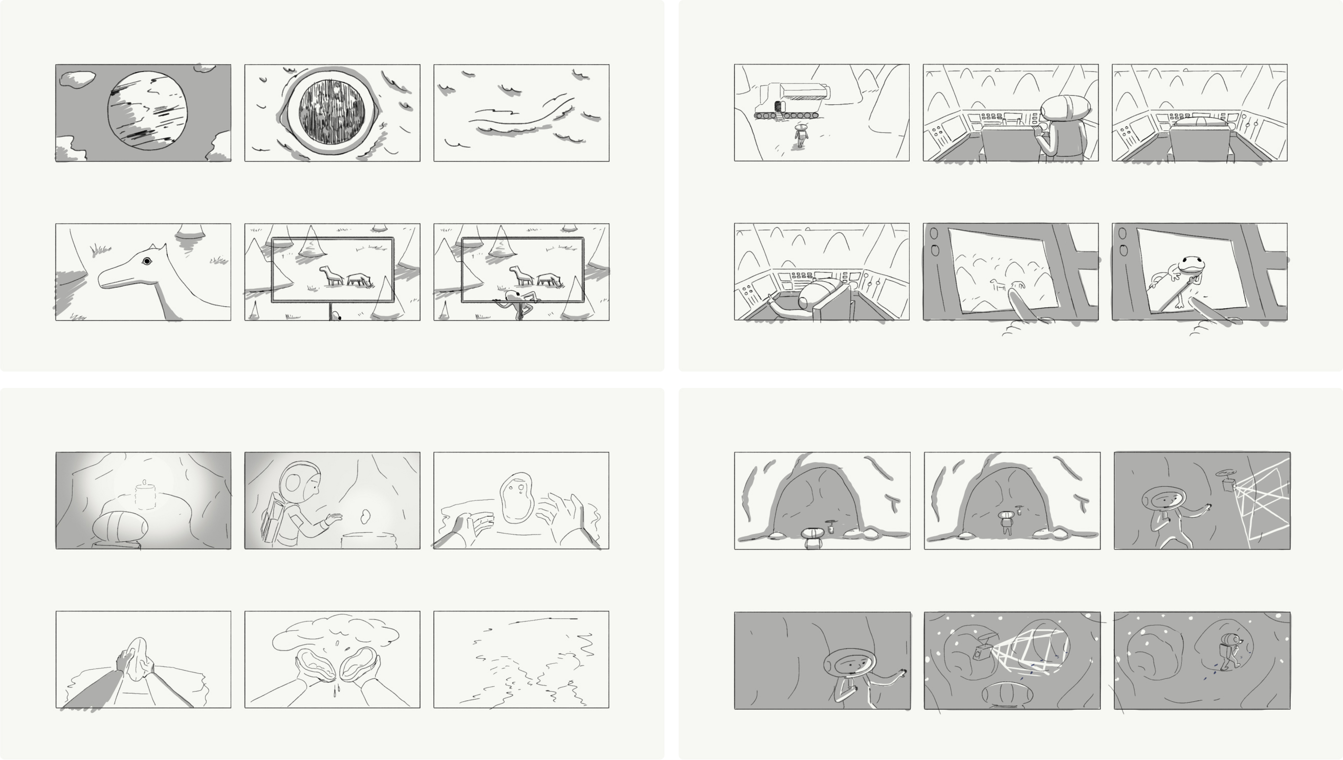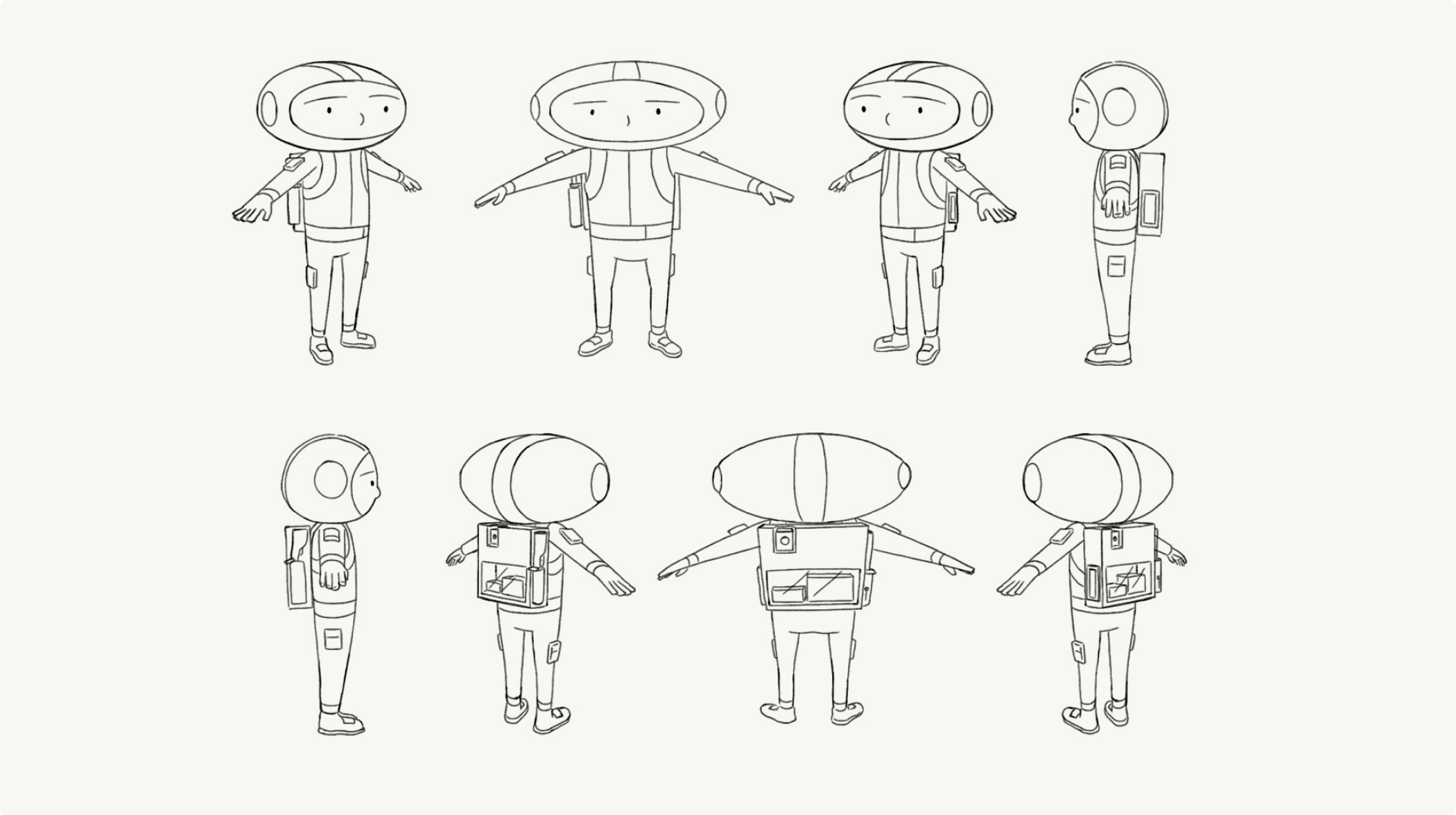 The character design in “Migration” is markedly simple. Although the mouth is one of the most expressive parts of a face, Jeremy felt that including eyes and a nose alone would communicate effectively underlining his frequent pull toward focused, clean design. The Explorer wears a white outfit to emulate that of an astronaut exploring in space, and to emphasize the purposeful progression of color and tone throughout the backgrounds in the film. There’s nothing that really defines the Explorer as anyone specific; this was intentional to ensure that the viewer could imagine themselves as the character, adding to the overall sense of adventure and discovery.