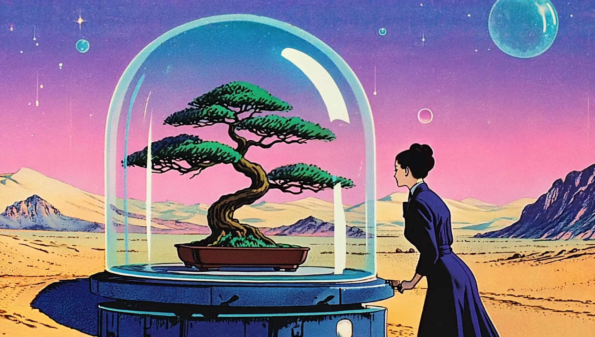 Retro anime aesthetics meet dreamy sci-fi in a technicolor explosion of flowers and flying saucers. That distinct 70s manga feeling - bold lines, cosmic backgrounds, and an irresistible mix of the romantic and the surreal.